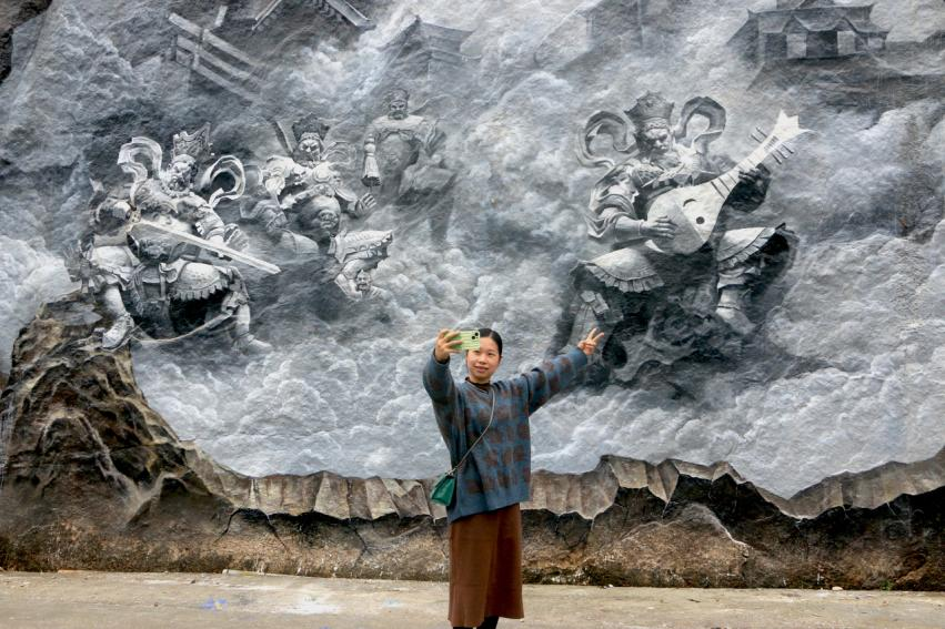 在台州市黄岩区富山乡南征顶村,只见十几幅大小不一的壁画,分布在沿着水库蜿蜒伸展的村道一侧。头戴金冠的齐天大圣正从耳中抽出金箍棒,四大天王手持法器乘云踏雾而来,蜿蜒盘旋的小白龙似乎要破壁而出……惟妙惟肖的画面,吸引不少游客前来打卡。