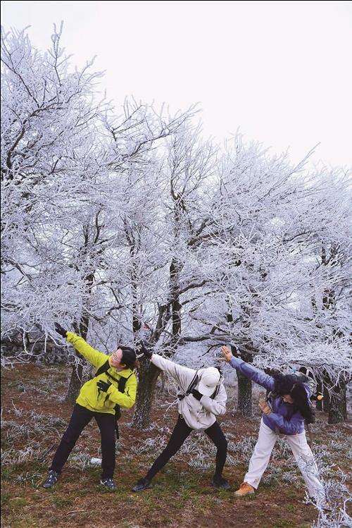 “一路上近70度的坡接坡,让我的心率飙升,感觉心脏都要跳出来了。到半山腰就已经被浓雾笼罩,能见度几乎为零。随着海拔的升高,温度越来越低,雾凇结冰现象也更加明显,但是路面非常滑,不小心摔了两跤。不过顶上的风景真是美得让人心醉,仿佛进入了童话世界。”小王说,一天下来虽然体力消耗非常大,但和朋友们一路上说说笑笑、拍照打卡,这种体验难能可贵。