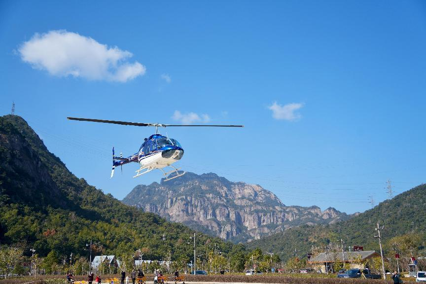 1月1日,在浙江省乐清市雁荡山旅游集散中心附近的停机坪上,工作人员们搭乘直升飞机,飞跃飞泉、灵峰、灵岩、大龙湫等多个景区,对航线的路线、时长设置以及飞行过程的相关细节工作进行测试。经过30多分钟的飞行,直升机顺利平稳返航,成功完成首次试飞。