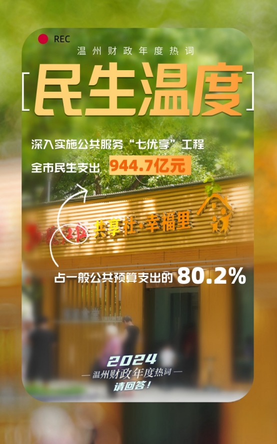 2024年,温州全市民生支出944.7亿元,占一般公共预算支出比重的80.2%,公共服务“七优享”工程深入实施,持续提升人民幸福指数:投入56.9亿元支持优化基础教育设施布局,新改扩建中小学136个,公办义务“教共体”实现全覆盖;统筹36.1亿元助力高校高质量发展;率浙江省之先探索建立职业教育差异化生均拨款制度,有力支持职业教育高地建设;投入2.2亿元支持构建高质量充分就业创业促进体系;全市投入7.9亿元推进人才友好型城市建设;投入7.8亿元联动推进婴幼儿照护服务城市、国家儿童友好城市、老年友好城市建设,支持普惠托育服务镇(街)覆盖率达91.4%,建成儿童友好试点单元、妇儿服务驿站等261个,建成助餐服务点439家、新增养老机构床位5414张;投入10.4亿元推动基本公共卫生资源均衡配置;投入1.4亿元足额保障“健康卫士工程”落地见效,受益群众超47万人次;健全医疗费用兜底保障机制,筹资建立5000万元规模“医保暖心无忧基金”,减轻家庭医疗支出负担;统筹24.8亿元支持优化医疗布局,加快浙南公共卫生紧急医疗救援基地、市中心医院双屿院区等项目建设。