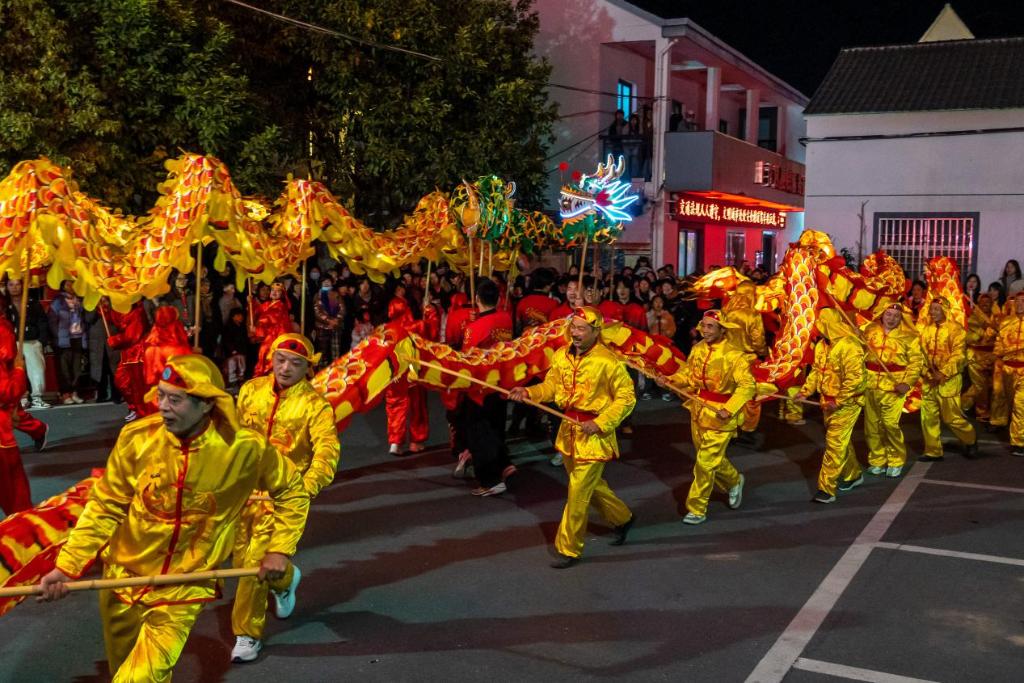 在浙江省衢州市柯城区万田乡上蒋村内,观灯的市民兴致不减,舞灯的队员热情高涨。新华网 张灵 摄