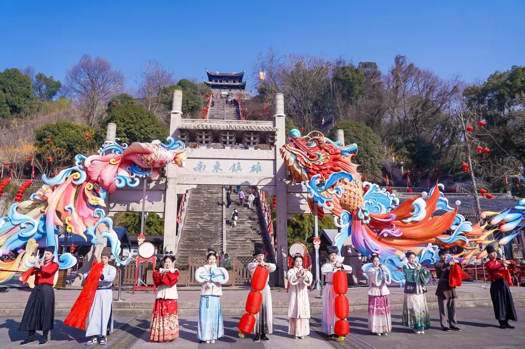 上午,台州府城文化旅游区内揽胜门前“舞福登高”,身穿汉服的景区工作人员,用歌舞将喜气传递给广大市民、游客,向大家送上了新春的“第一声祝福”。精美的鱼、龙花灯盘旋在“雄镇东南”的牌坊前,向大家发出登高望远的邀请。浩浩荡荡的人群,在江南长城的注视下,拾级而上,带着对崭新时光的期待向上攀登、勇毅前行。