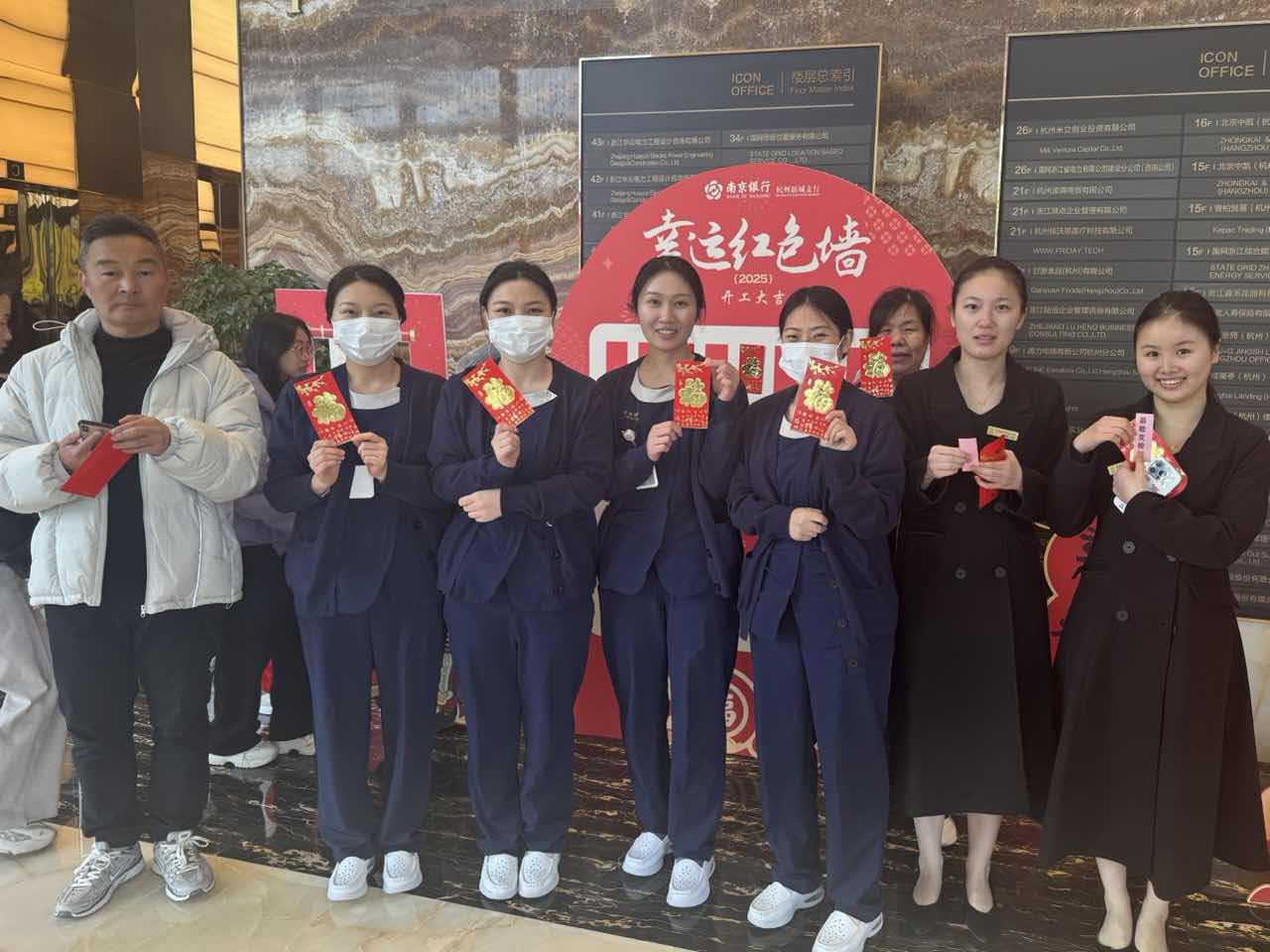 活动正值上班高峰期,红包墙前围满了前来报到的企业员工,现场气氛浓厚,大家积极加入南京银行企业服务群,领取开工伴手礼,为新年工作生活赋予吉祥寓意。一位参与活动的企业职工向银行工作人员表示:“我在这里工作多年,这是我第一次参与如此温馨的企业送祝福新春活动,新年开工也更有动力了。”周围的企业员工们也表示赞同,纷纷在红包墙处合影留念。