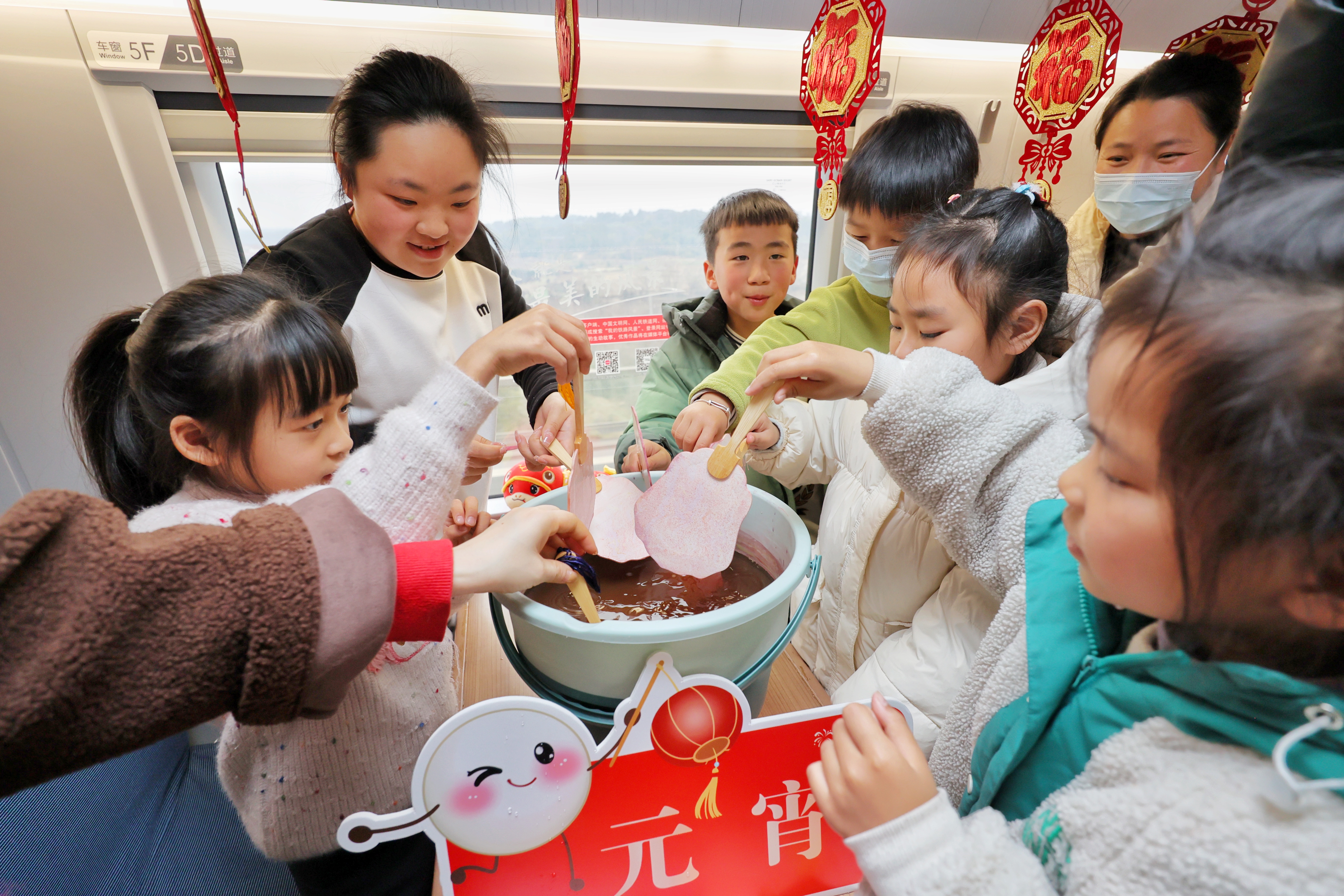 2月12日元宵佳节,杭州东开往怀化南的G1307次列车餐车张灯结彩,节日氛围浓厚。中国铁路上海局集团有限公司杭州客运段与杭州乘警支队,在列车上精心策划并组织开展“灵蛇献瑞 喜乐元宵”主题活动,与旅客们共度元宵佳节。
