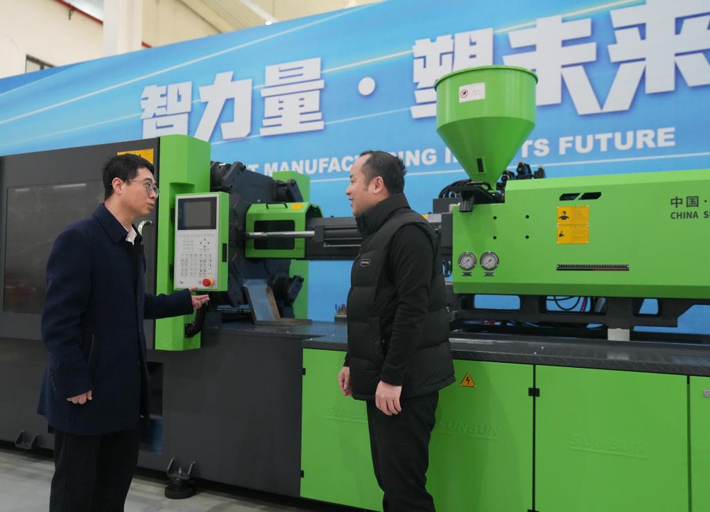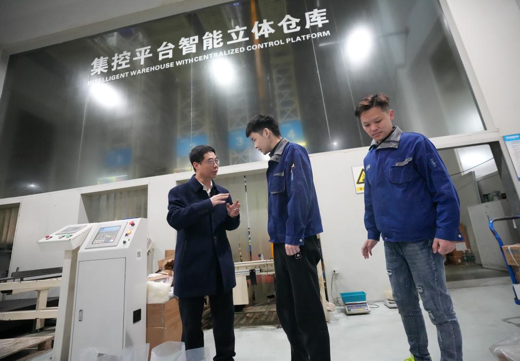 在浙江省温州市一家专精特新企业,胡东方(左)向一线工人了解智能设备运行情况(2025年2月18日摄)。