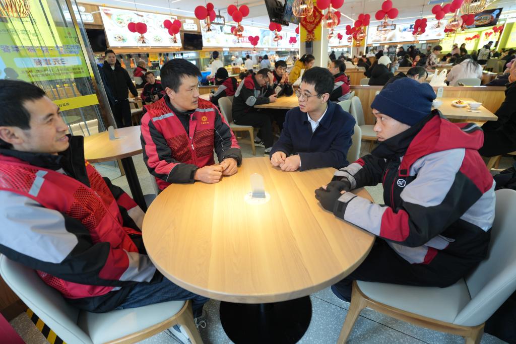 胡东方(前右二)在浙江省温州市一家户外劳动者餐厅和快递员交谈(2025年2月18日摄)。