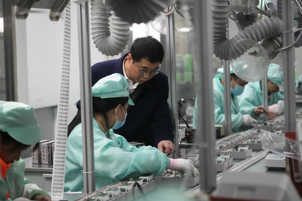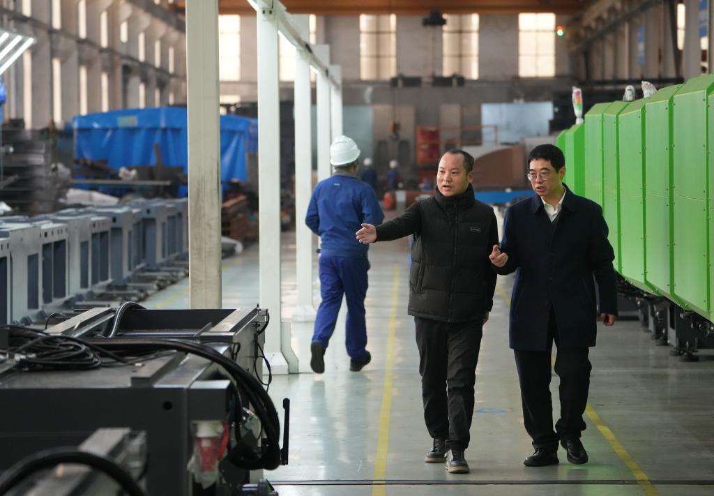 在浙江省温州市一家专精特新企业,生产负责人向胡东方(右)介绍企业自主创新情况(2025年2月18日摄)。