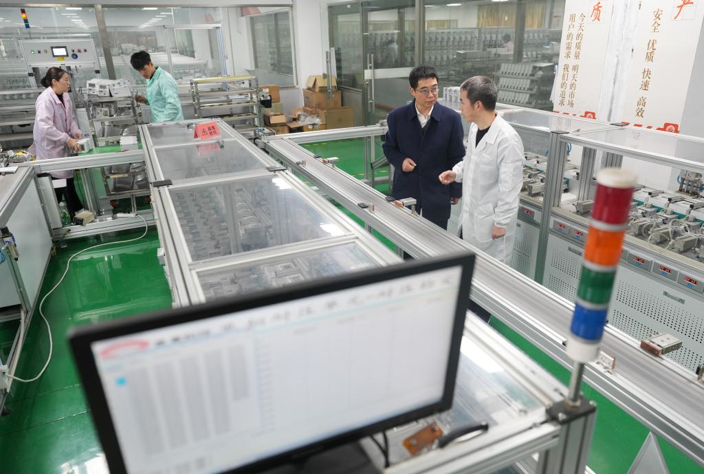 在浙江晨泰科技股份有限公司,胡东方(右二)与生产负责人交流自动化电表生产线运行状况(2025年2月18日摄)。