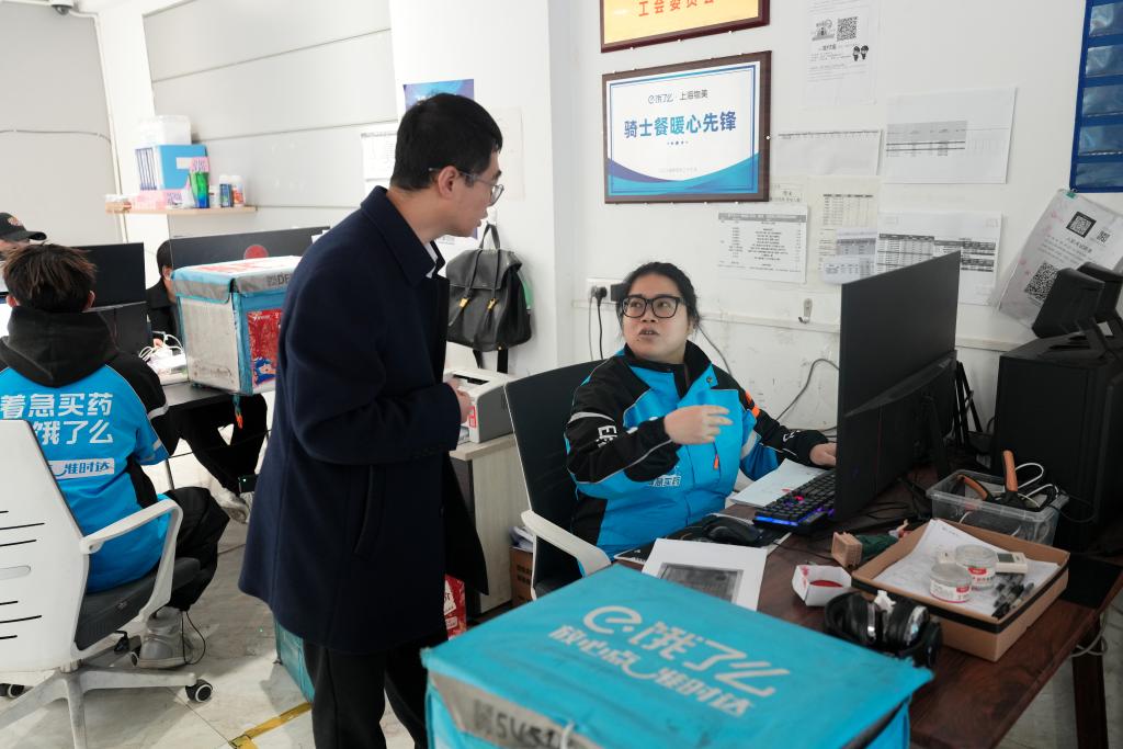胡东方(右二)在浙江省温州市一家外卖骑手站点与工作人员交流(2025年2月18日摄)。