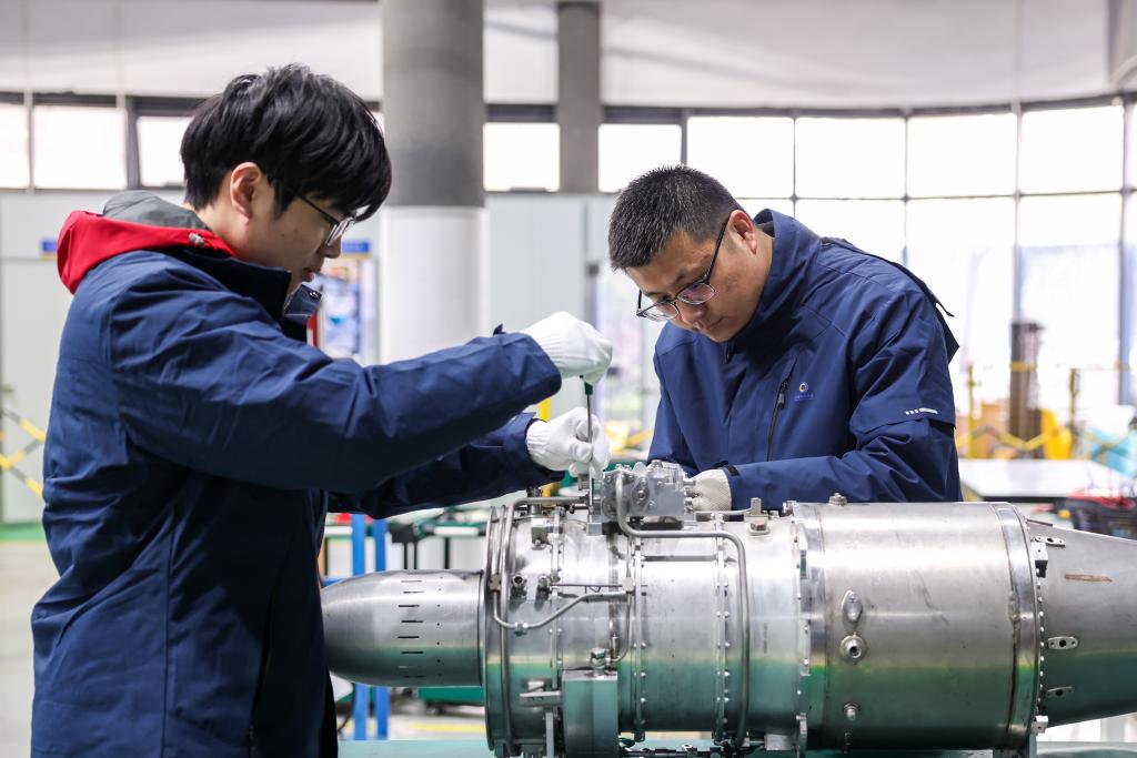 2月28日,浙江华擎航空发动机科技有限公司的工作人员在宁波市江北区的车间内装配无人机航空发动机产品。新华社记者 江汉 摄