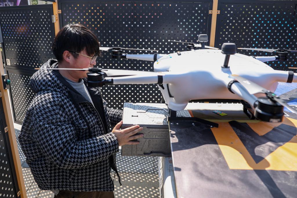 2月28日,市民在位于宁波市江北区老外滩的一处无人机配送智能站接收由无人机配送的外卖。新华社记者 江汉 摄