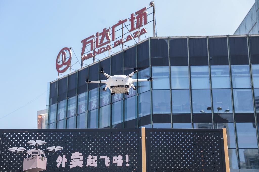 2月28日,无人机从宁波市江北区一处商业综合体起飞准备开始配送外卖。新华社记者 江汉 摄
