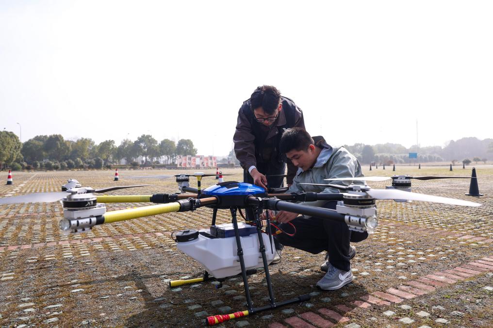 2月28日,在位于宁波市江北区的宁波芸济飞行时代低空科创基地内,学员(右一)进行无人机飞行实操训练。新华社记者 江汉 摄