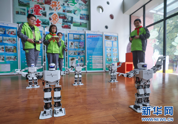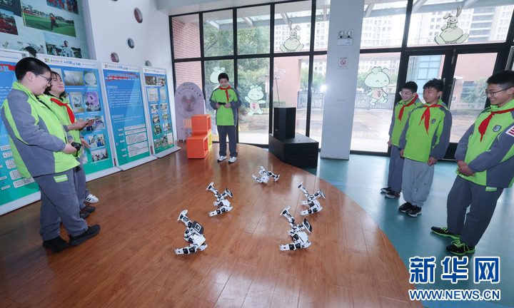 3月12日,在嘉兴市实验小学科技城校区科创中心内,智能机器人社团的学生们在对编码完成的智能机器人进行动作指令调试,并使用平板统一控制多台智能机器人完成精彩的舞蹈表演。该学校被评为全国人工智能教育示范基地。新华社记者 徐昱 摄