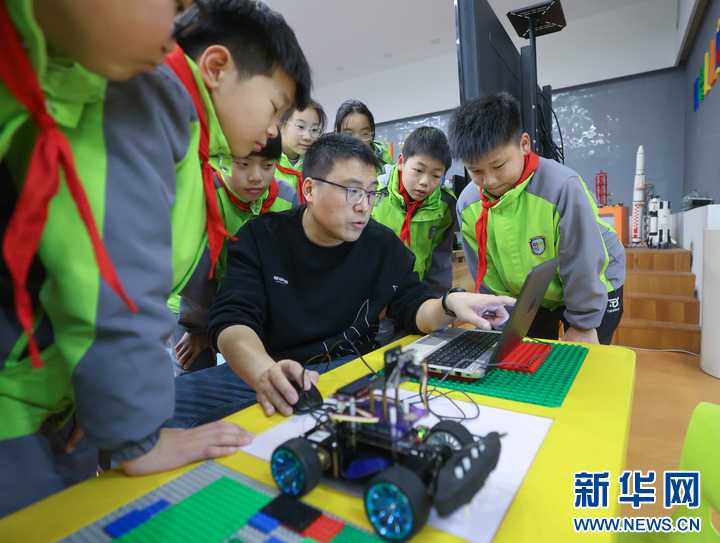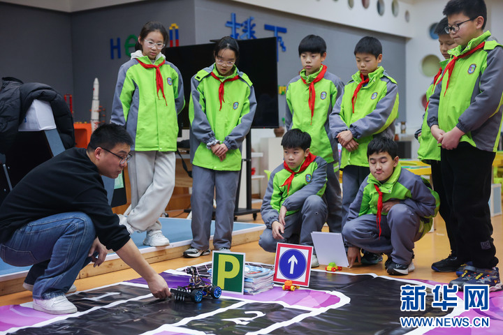 3月12日,在嘉兴市实验小学科技城校区科创中心内,老师指导学生通过编程为智能小车设计自动行驶算法,在模拟现实的路况中,自动识别道路和交通标志,实现自动驾驶。新华社记者 徐昱 摄