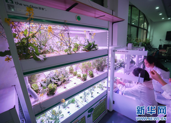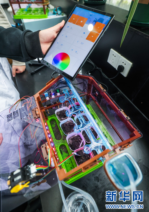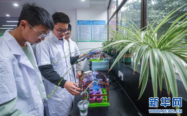 3月12日,在嘉兴市东北师范大学南湖实验教育集团智慧生态实验室内,学生们利用基于物联网的水培系统进行生物的培育实验。该教育集团被评为全国青少年人工智能活动特色单位。新华社记者 徐昱 摄