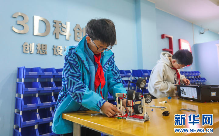 3月12日,在嘉兴市东北师范大学南湖实验教育集团科创中心教室,学生在搭建智能机器人。该教育集团被评为全国青少年人工智能活动特色单位。新华社记者 徐昱 摄