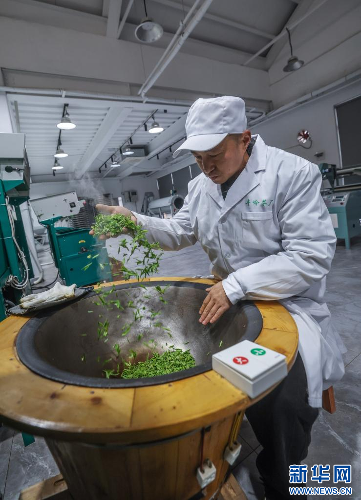 3月14日,在中泰街道枫岭村枫岭茶谷共富工坊里,茶厂工人为茶农手工炒制新茶,方便农户在自家茶家乐售卖。