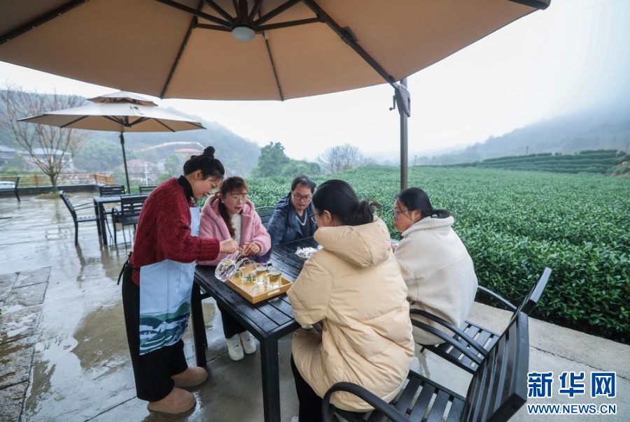 3月14日,在中泰街道枫岭村茶家乐里,游客在品尝第一茬的春茶。