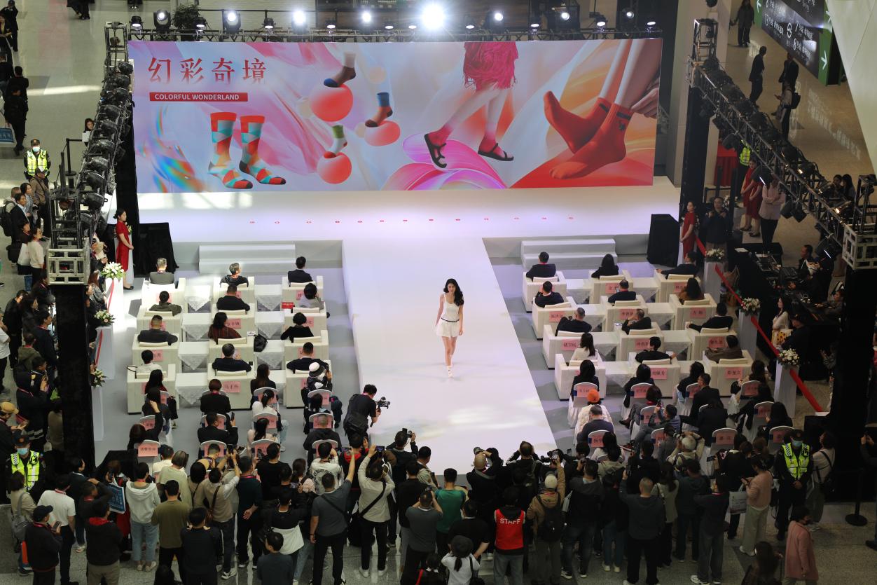活动现场,2025/2026中国袜品流行趋势发布秀人气最高,集结了大唐袜业产业集群莎耐特、卡拉美拉等5家优秀企业和品牌,500多款创意新款袜品,为业内人士和客商带来艺术与设计的视听盛宴。