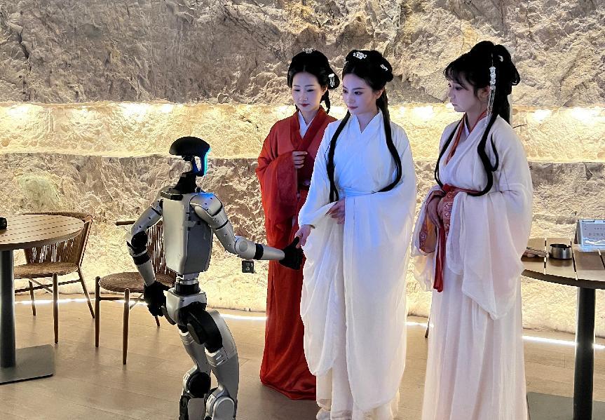 身着传统汉服的表演者与机器人同台互动。叶金涛 摄