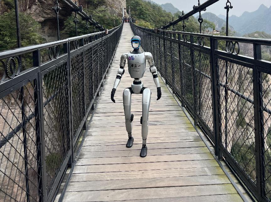 活动现场,机器人和机器狗在操作指令下完成巡山、避障、攀爬等高难度动作。面对“天空之桥”的挑战,机器人和机器狗以稳健步伐跨越长达百米的铁索桥,引得游客连连惊叹。