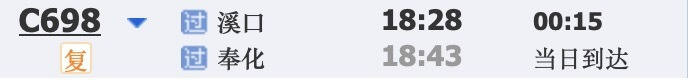 C698次,每天18:28从溪口开出,18:43到达奉化,全程15分钟。
