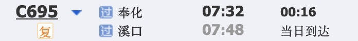 C695次,每天7:32从奉化开出,7:48到达溪口,全程16分钟,二等座票价9元。