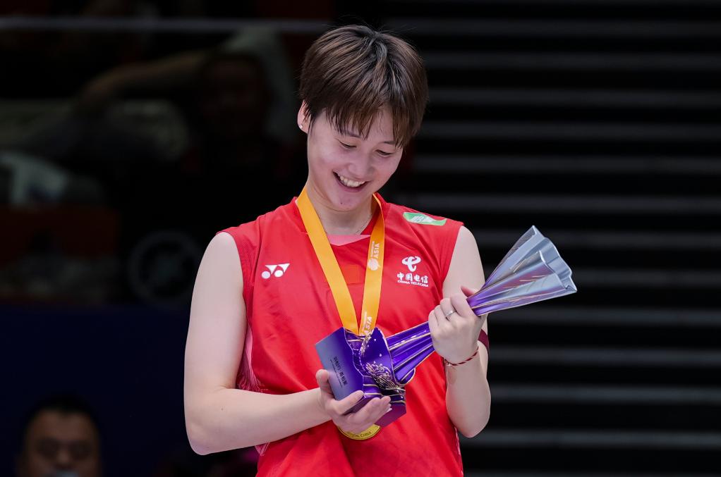 4月13日,陈雨菲在颁奖仪式上手捧奖杯。新华社记者 孙非 摄