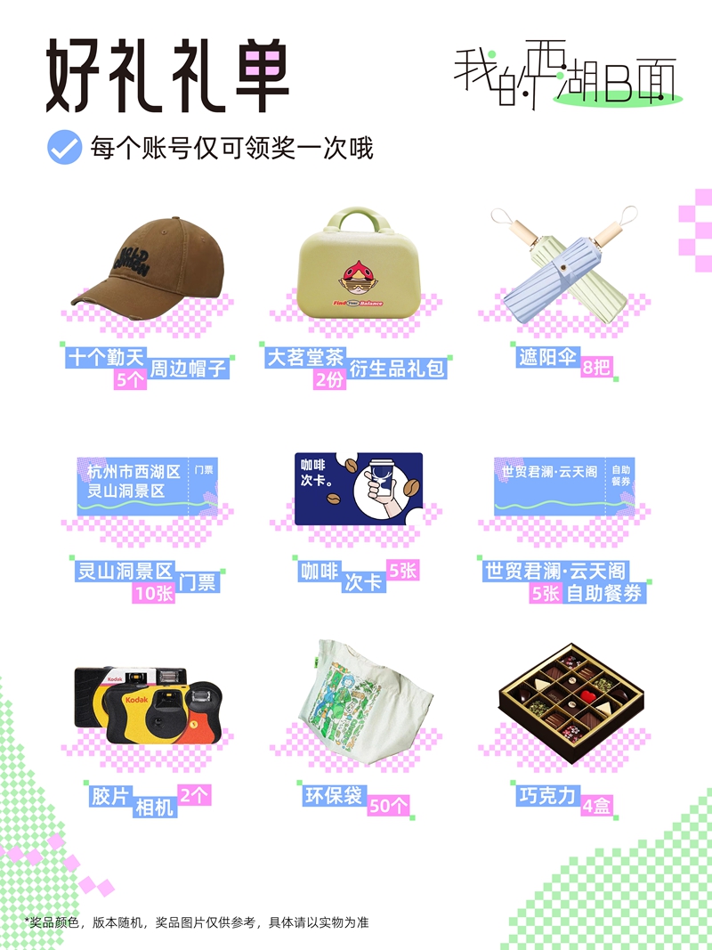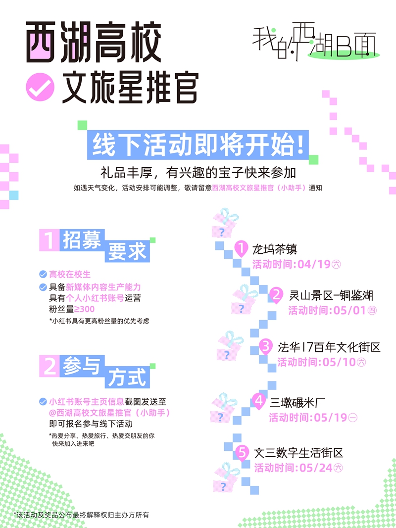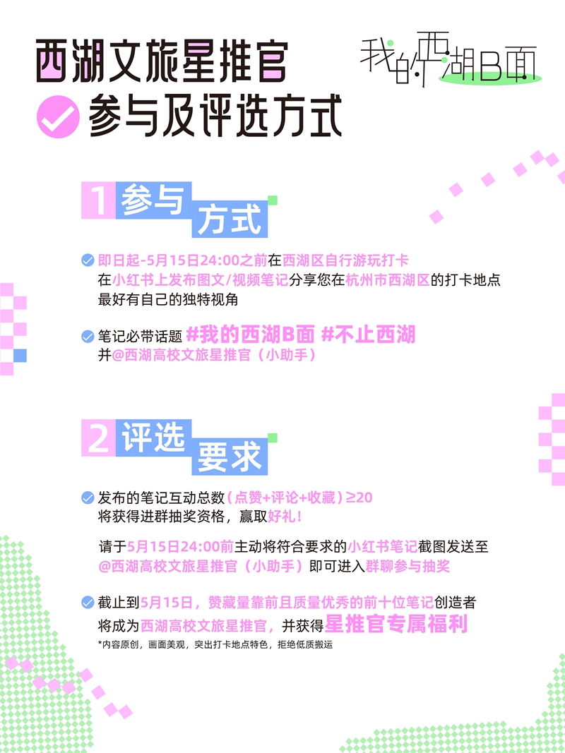 活动邀请所有大学生一起用镜头和故事揭开西湖的另一面精彩。4月14日至5月15日,大学生发布小红书笔记,打卡西湖区任意景点,拍出独特视角带上话题 #我的西湖B面 #不止西湖@西湖高校文旅星推官,即可赢取奖品福利。