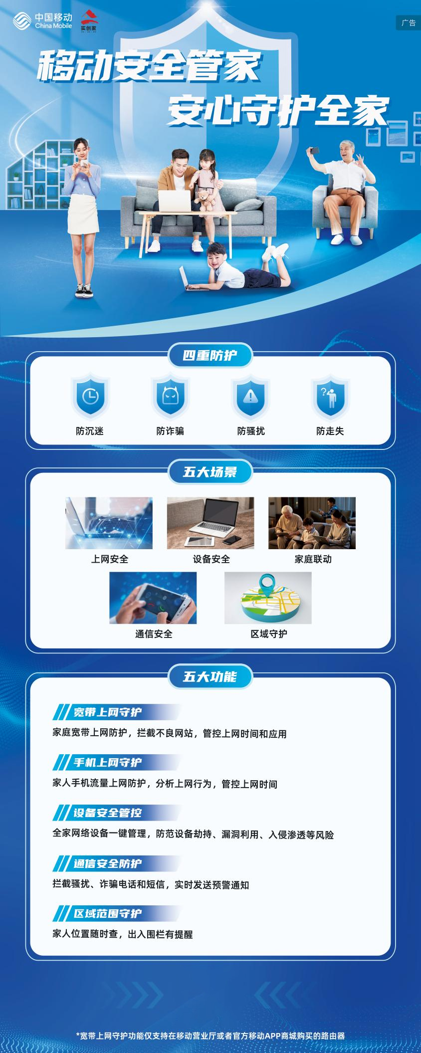 近年来,面对日益复杂的网络诈骗手段、骚扰电话以及未成年人网络保护等新挑战,中国移动积极响应国家网络安全战略号召,充分发挥通信领域的技术积淀与创新优势,推出“中国移动安全管家”产品。该产品覆盖上网安全、设备安全、家庭联动、通信安全和区域守护五大场景,提供防诈骗、防沉迷、防骚扰、防走失四重防护,全方位守护用户的通话与上网环境,为万千家庭构建坚实的网络安全防护体系。