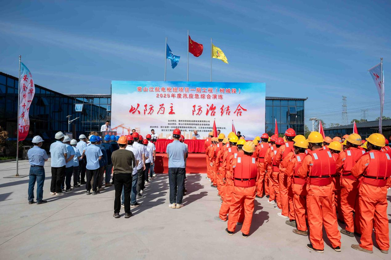 常山江航电枢纽项目位于钱塘江流域,每年4月至7月主汛期期间,上游20余座水库泄洪叠加频繁暴雨,易导致河道水位骤升,威胁施工安全。此次演练以“上游围堰外江水位突发上涨”为模拟场景,高度还原汛期险情,全面检验应急预案的实战效能。