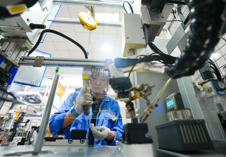 在位于浙江省诸暨市店口镇的浙江万安科技股份有限公司,工作人员在装配汽车角度传感器(2025年4月7日摄)。新华社记者 翁忻旸 摄