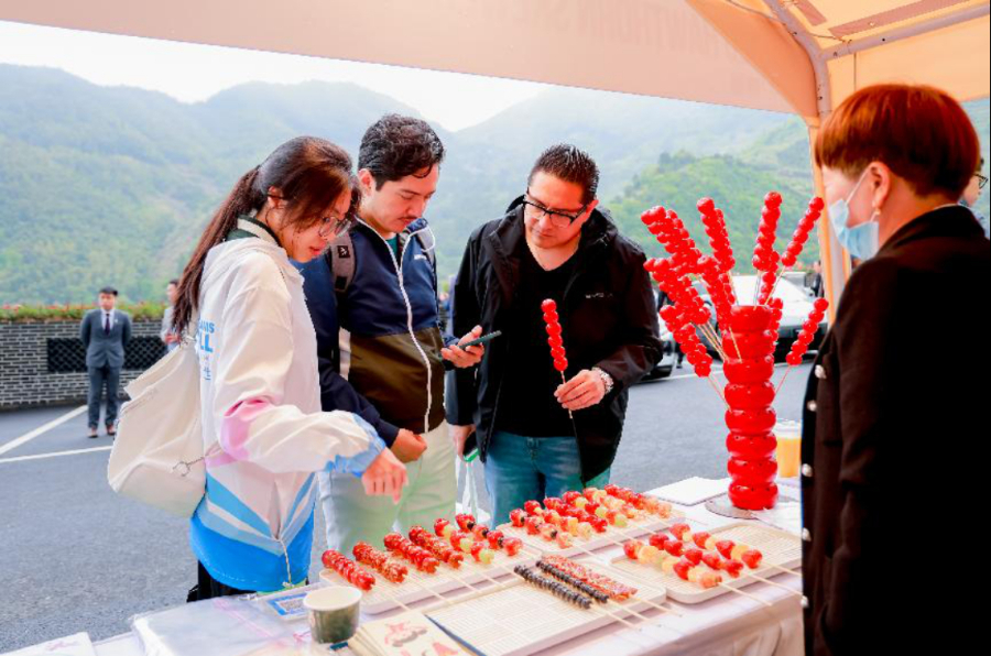 午后,西白山村的千亩茶园中,代表们腰系竹篓,指尖轻掐嫩芽,在采茶农户指导下参与采摘体验。“采茶要选一芽两叶,指尖轻轻提采,不能掐断。”茶农一边示范,一边耐心讲解。代表们小心翼翼地尝试着,时而因成功采到标准嫩芽而欢呼,时而为动作不够标准向茶农请教。来自墨西哥MAG Group的Luis Macias表示:“这里太美了,这是我第一次采茶,感觉很有意思。我要把这些拍下来并分享给我的朋友们。”