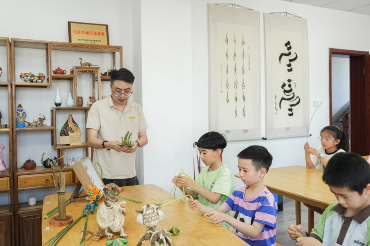 非遗手工课是最受青少年欢迎的课程。嘉兴非遗传承人曾修权手把手教孩子们制作蚱蜢、知了、蜻蜓等工艺品,生动的讲解让各族青少年沉浸式感受非遗魅力。在油车港胜丰“石榴籽”研学基地,农民画家吴新云、缪惠新指导孩子们创作富有生活气息的农民画,让传统文化在笔尖流淌。
