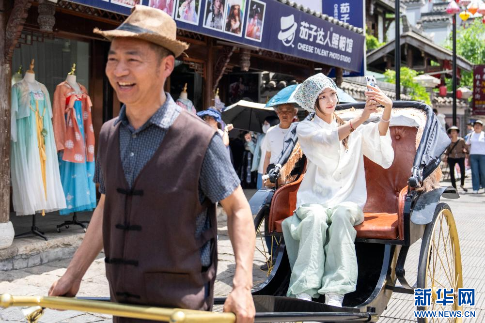年轻游客在湖南常德河街乘坐黄包车打卡拍照(5月3日摄)。新华社记者 陈思汗 摄