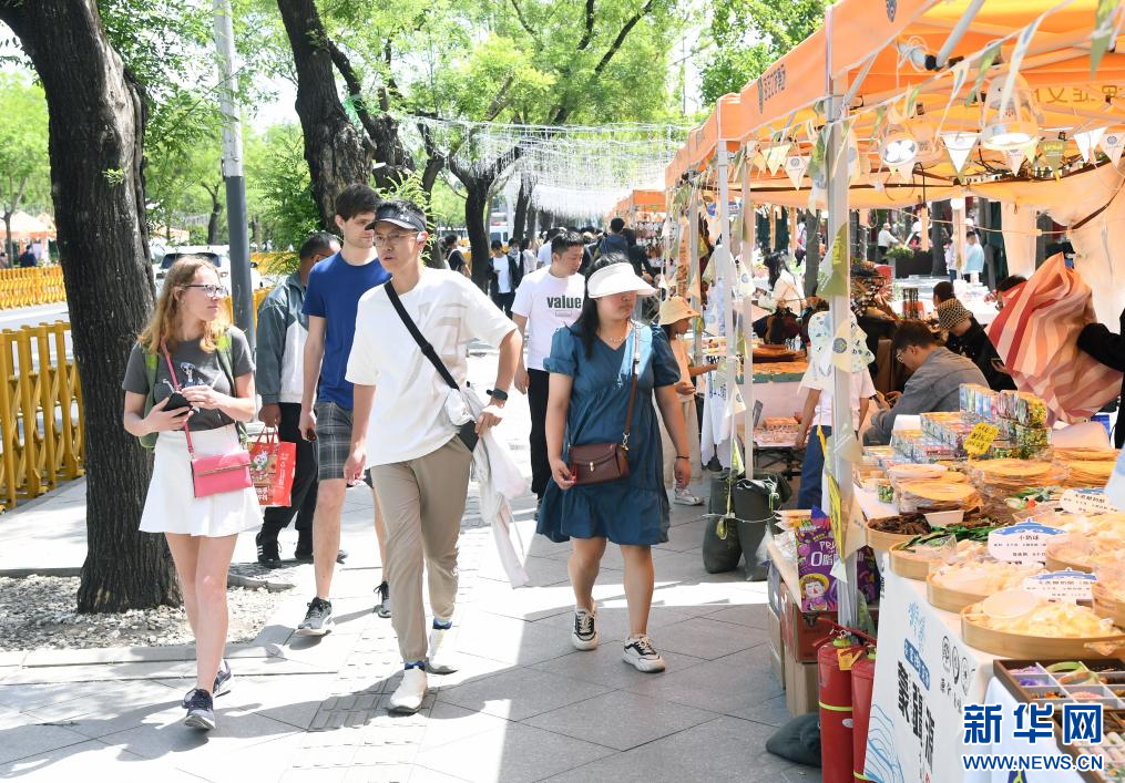 5月4日,游客在北京市海淀区同庆街举办的“琉璃逸夏”三山五园文化市集现场游览。新华社记者 任超 摄