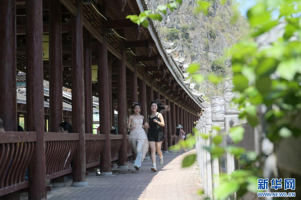 河南商丘市的青年在广西百色市浩坤湖侗族特色建筑风雨廊桥打卡游玩(5月3日摄)。新华社发 苗育才 摄