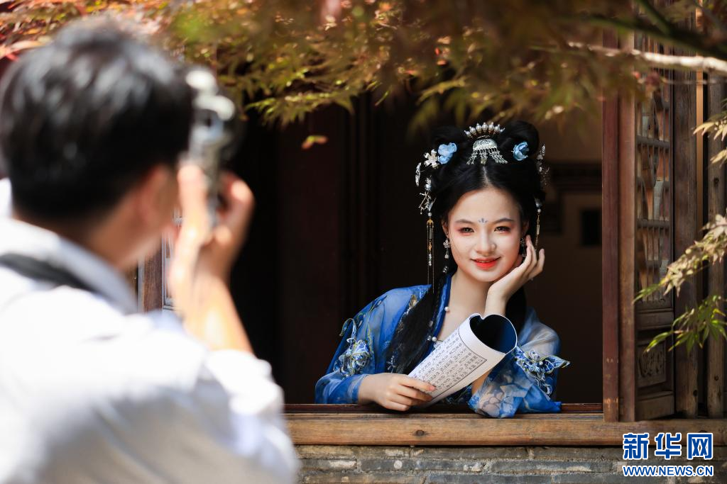 5月4日,游客在南京老门东景区体验旅拍写真。新华社发 苏阳 摄