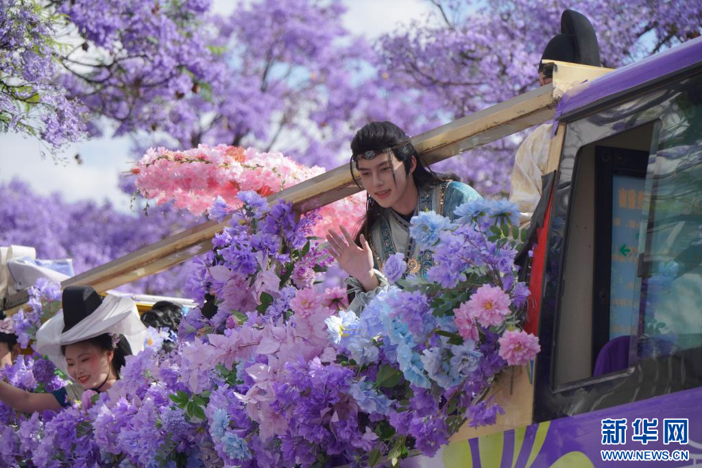 5月4日,在云南省昆明市五华区,人们身着古装乘坐蓝花楹主题观光巴士。新华社记者 高咏薇 摄