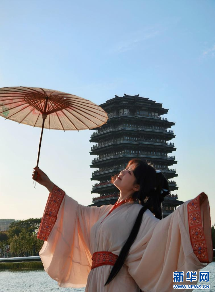 一名穿汉服的游客在山东省淄博市齐盛湖公园拍照打卡(5月3日摄)。新华社记者 吴青昊 摄