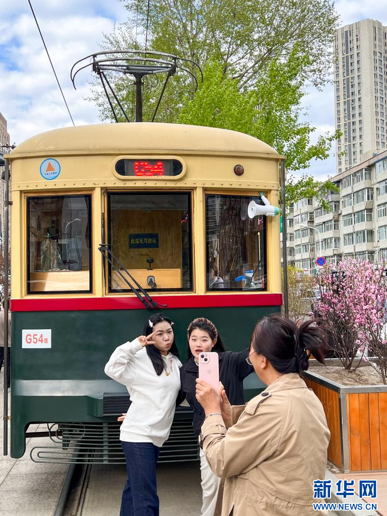 在吉林省长春市,两名年轻人与54路有轨电车合影(5月2日摄)。新华社记者 张楠 摄