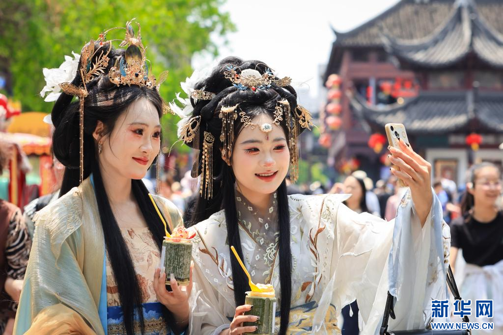5月4日,游客身着传统服饰在南京夫子庙景区游览拍照。新华社发 苏阳 摄