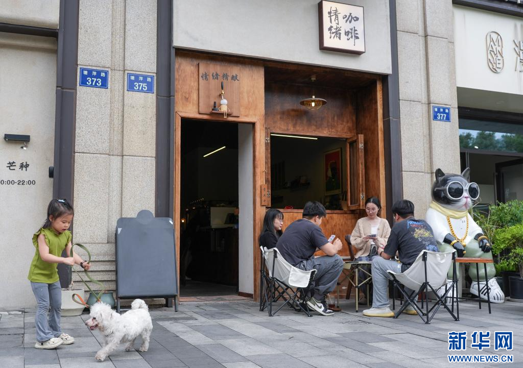 年轻人围坐在浙江杭州市拱墅区一家咖啡店的门口休闲娱乐(5月4日摄)。新华社记者 黄宗治 摄