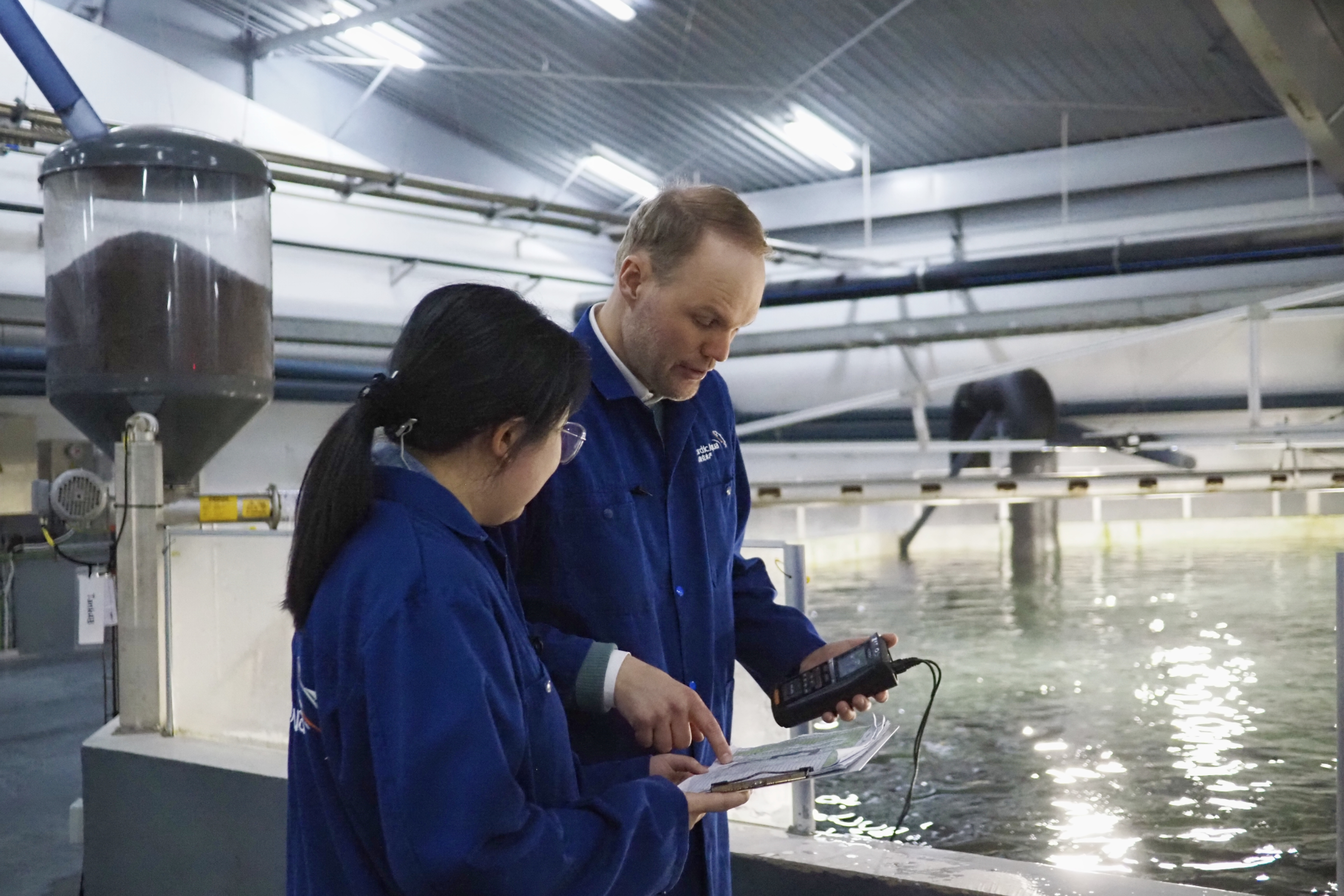 4月16日,诺帝克水产(宁波)有限公司总经理童安睿(右)与技术人员在位于浙江省宁波市象山县的RAS陆基养殖基地内检测养殖池水质。新华社记者 刘梓漪 摄