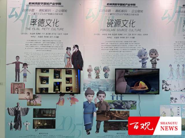 地域文化创新成为展览亮点,不少展览中含有上虞元素。视觉传达专业朱凯峰的《二十之》设计系列以兰亭雅集为灵感,通过黄酒品牌视觉升级与动态标识系统设计,打造“日间餐厅+夜间酒馆”的全时段消费模式。“我们尝试用Z世代的设计语言重构传统文化,让黄酒文化成为年轻人追捧的新国潮。”朱凯峰阐释其创作理念。杭州湾数字智能产业学院则运用数字形式,将孝德文化、瓷源文化、东山文化、春晖文化等地域IP转化为数字动画,构建可交互的文化传播新范式。