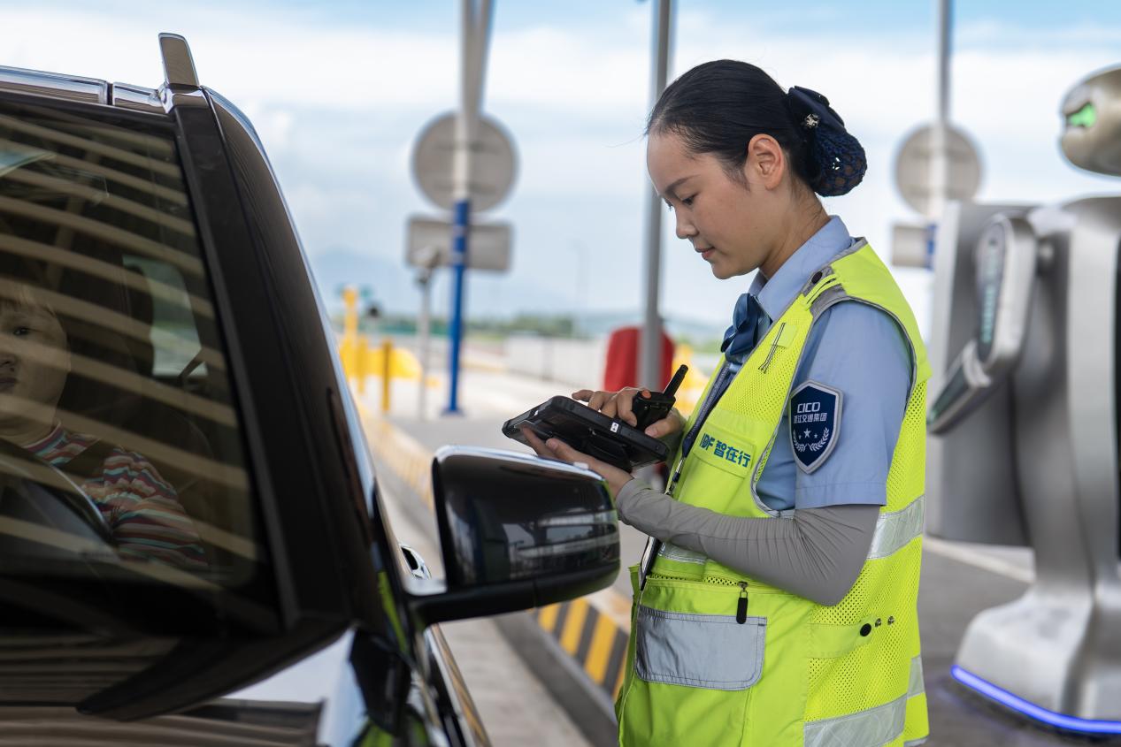 收费员手持单兵作战机为司乘提供快速通行服务。