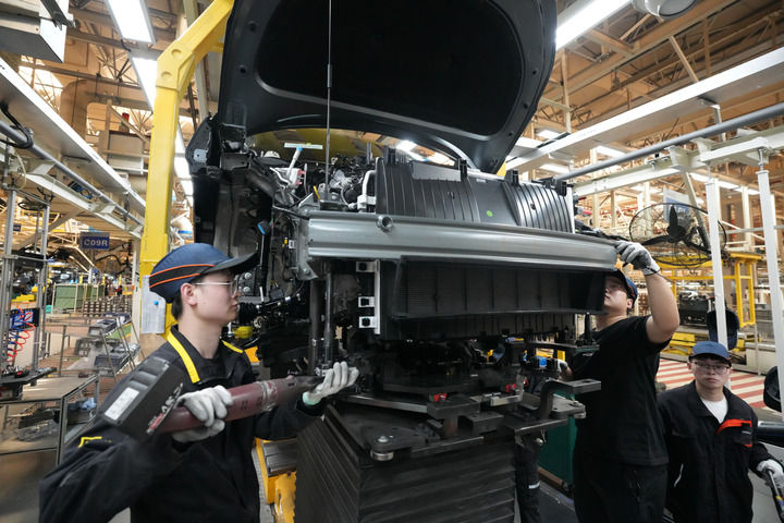 在吉利汽车临海制造基地,工作人员为新能源车安装电池包(2025年4月8日摄)。新华社记者 翁忻旸 摄