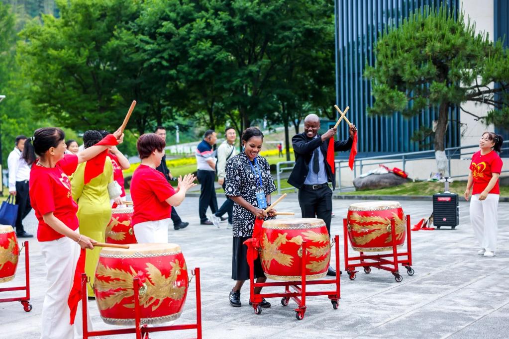 5月15日,非洲媒体代表与浙江省湖州市安吉县余村村民一起打鼓。新华社发