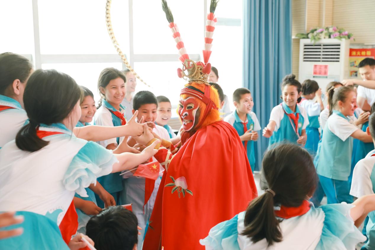 “原来戏曲可以这么有趣!”四年级学生艾力江·买买提在互动环节上台,跟着老师学起了孙悟空玩转金箍棒的经典动作。